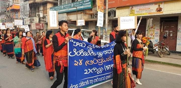 The Chakma community in Tripura, India, celebrates International Mother Language Day with banners written in the Chakma script. In the CHT, Chakma Buddhists face systematic Bengalization and Islamization in a highly militarized region. Many indigenous families are forcibly converted to Islam, and their children are trafficked and Islamized.