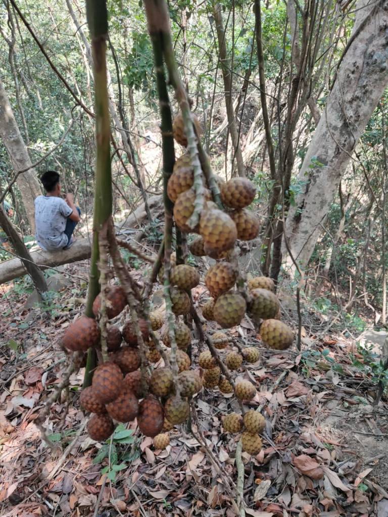 ভুলংতলি বনের বড় বড় ধারালো পাথর : অতঃপর মোনের আরো গভীরে প্রবেশ করলাম। এখন যেখানে প্রবেশ বনের ভিতর কোন রাস্তা নেই সবই খোলামেলা, চারদিকে উঁচু উঁচু বৃক্ষের কারনে একটুও ছায়া নেই। সাথে বৃক্ষরাজির নিচে হাটু সমান গাছের শুকনো পাতা আর বড় বড় পাথর। কালো ঝরঝরে মাটির সাথে নানা হরেক জাতের পিপড়া গুলো পাতার গুলোর উপরে বাসা বেধেছে। উঁচু পাহাড় বেয়ে উঠতে খুবই কষ্ট। মাঝে মাঝে ভাল্লুকের গাছ চিড়ে মধু খাওয়া গুলো দেখা যাচ্ছে। বনের ভাল্লুক গুলো বড় বড় গাছ গুলোতে নক লাগিয়ে দাগ সৃষ্টি করেছে। সাথে বানর দল গুলো ” গ্রি” আম গাছটির মাথায় আম খাচ্ছে। বিশাল দৈত্যাকার গ্রি আম গাছটির নিচে হাজারো পাকা আম পড়েছে। মঙ্গল চান,সজীব দা সহ সবাই আমের টেষ্ট নিতে ব্যস্ত! মধুর মত আম গুলো কিছু খাওয়ার পর আবার “গিলের” লতি বেয়ে ভুলংতলি মোনে উঠতে লাগলাম।