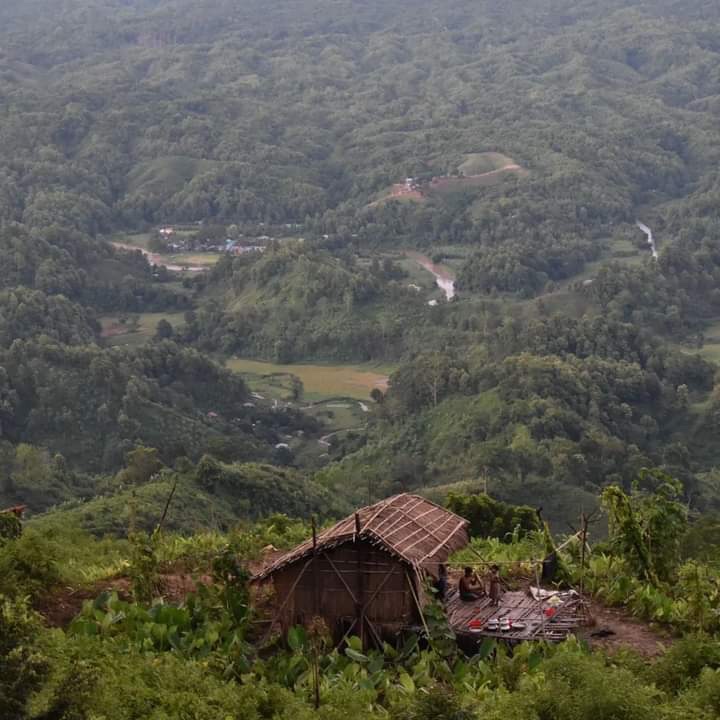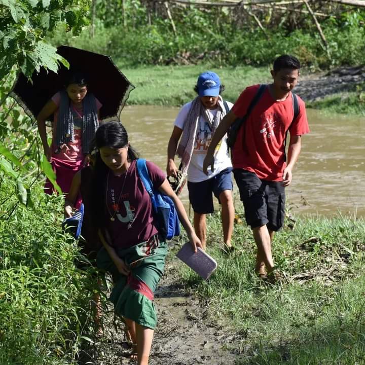 সুন্দর উপত্যকা ধরে পাহাড়ের গোড়ায় যাচ্ছি, সাথে একদল শিশুও যাচ্ছে সাথে, যদিও তাদের উদ্দেশ্য অন্য গ্রামে যাওয়া আর আমাদের উদ্দেশ্য পাহাড়ে উঠা। উপত্যকার মাঝ বরাবর পাহাড়ি নদী বয়ে গেছে, সাথে বাশের তৈরী পাহাড়ি বাড়ি ও গ্রাম। বাঁশের সাঁকো বেয়ে নদী পার হয়ে একটি দোকান দেখতে পেলাম। দোকানে সকল বয়সের মানুষ জড়ো হয়ে ছায়াছবি দেখছে বড়বড় সাউন্ড করে। আমাদের দেখে তারা সবাই অবাক হয়ে থাকাল, আর জিগ্যেস করতে লাগল কোন দিকে যাচ্ছো? আমাদের উত্তর হল পাহাড় বেয়ে ওই গ্রামে যাব। দোকান ফেরিয়ে কিছুদূর এগোতেই সেই বোটে দেখা হওয়া ছেলেটির সাথে দেখা হল। তার বাড়িও সেই পাহাড়ের চূড়ায় গ্রামে, কয়েক মাস পর সে বাড়ি যাচ্ছে পরিবারের কাছে। খুব শান্ত স্বভাবের ছেলেটি আমাদের সাথে চলল- গত রাত হাল্কা বৃষ্টি হওয়ার কারণে ছোট্ট এ ছড়াটির পানির গতি বেড়েছে। আমাদের সাথে চলা স্কুলের শিশুরা রীতিমত লাফিয়ে লাফিয়ে ছড়া পার হলেও আমরা ছড়া পার হতে রীতিমত যুদ্ধ করছি।